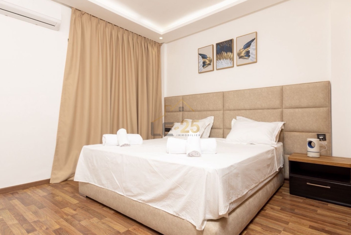 D’une superficie de 98 m², il est entièrement meublé avec goût et doté de mobilier de qualité. L’appartement se compose d’une chambre, d’une suite parentale avec salle de bain privative, d’une cuisine américaine ouverte sur le salon moderne, ainsi que d’une deuxième salle de bain. Alliant confort, élégance et emplacement privilégié, ce bien représente un choix idéal aussi bien pour y habiter que pour un investissement locatif rentable.