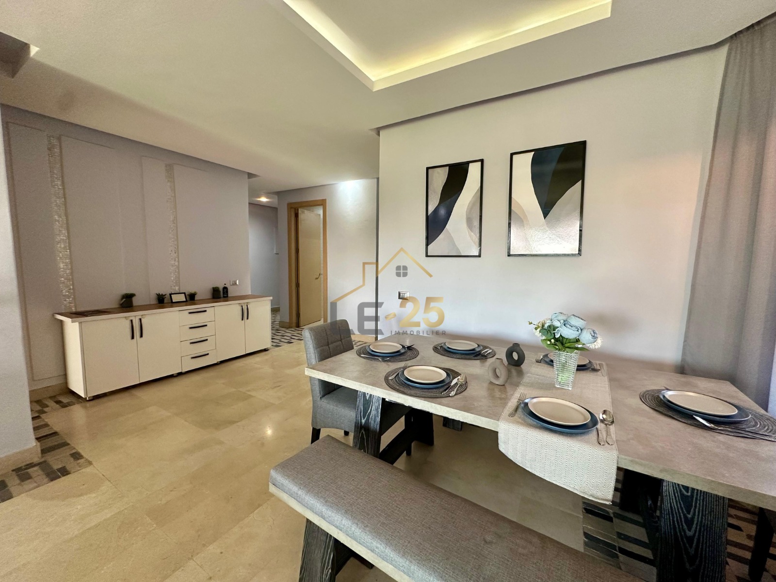 Le 25 Immobilier a le plaisir de vous proposer à la location ce magnifique appartement de 100m², entièrement meublé, avec la possibilité de le louer vide selon vos besoins. Situé en rez-de-jardin avec une vue imprenable sur le golf, il se trouve dans une résidence sécurisée et de standing, offrant un cadre de vie à la fois moderne et confortable.