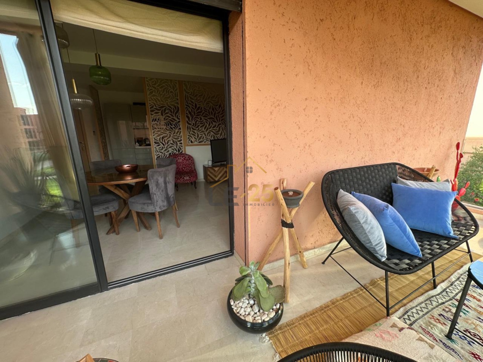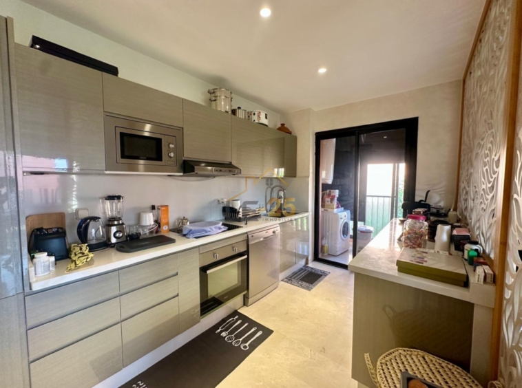 La cuisine indépendante, entièrement équipée, allie praticité et finitions de qualité. Le salon lumineux s’ouvre sur une agréable terrasse, parfaite pour profiter du climat de Marrakech et partager des moments conviviaux.