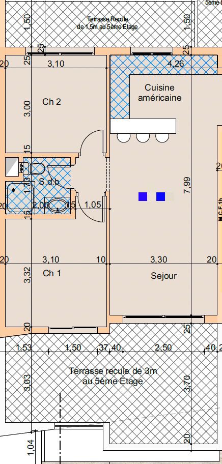 D’une superficie de 72 m² complétée par 20 m² de terrasses, il se compose de deux chambres, chacune avec accès à une terrasse, d’une salle de bain moderne, ainsi que d’un salon lumineux avec cuisine américaine ouverte.