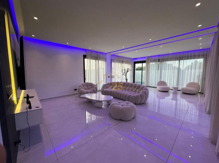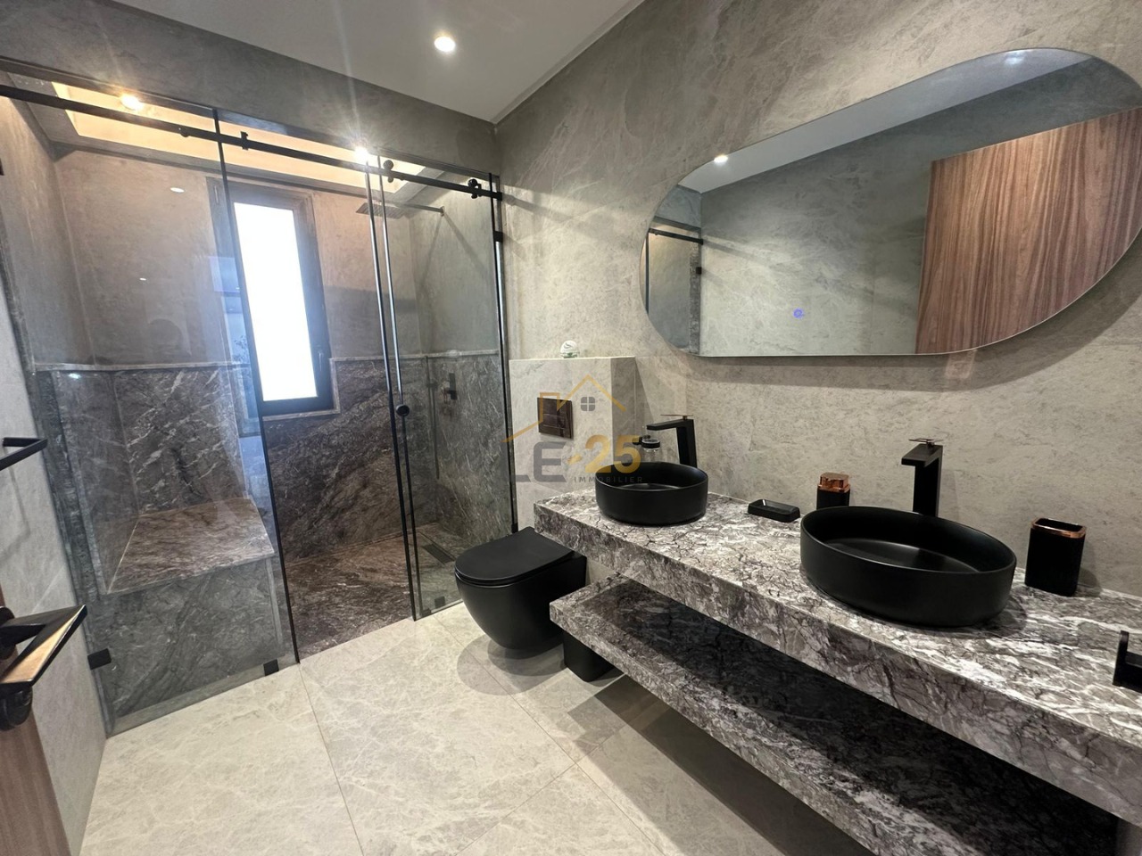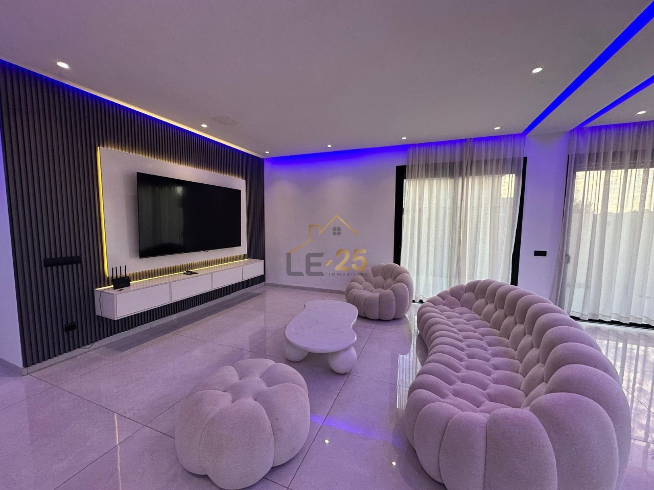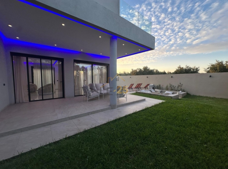 Les prestations haut de gamme incluent une piscine chauffée, un crépi mono couche Weber, un hammam beldi, une menuiserie aluminium à double vitrage, un panneau solaire 5 kW, une climatisation centralisée, un système de vidéo surveillance, un portail motorisé, un carrelage 120/120 de style turc, et une robinetterie Imex.