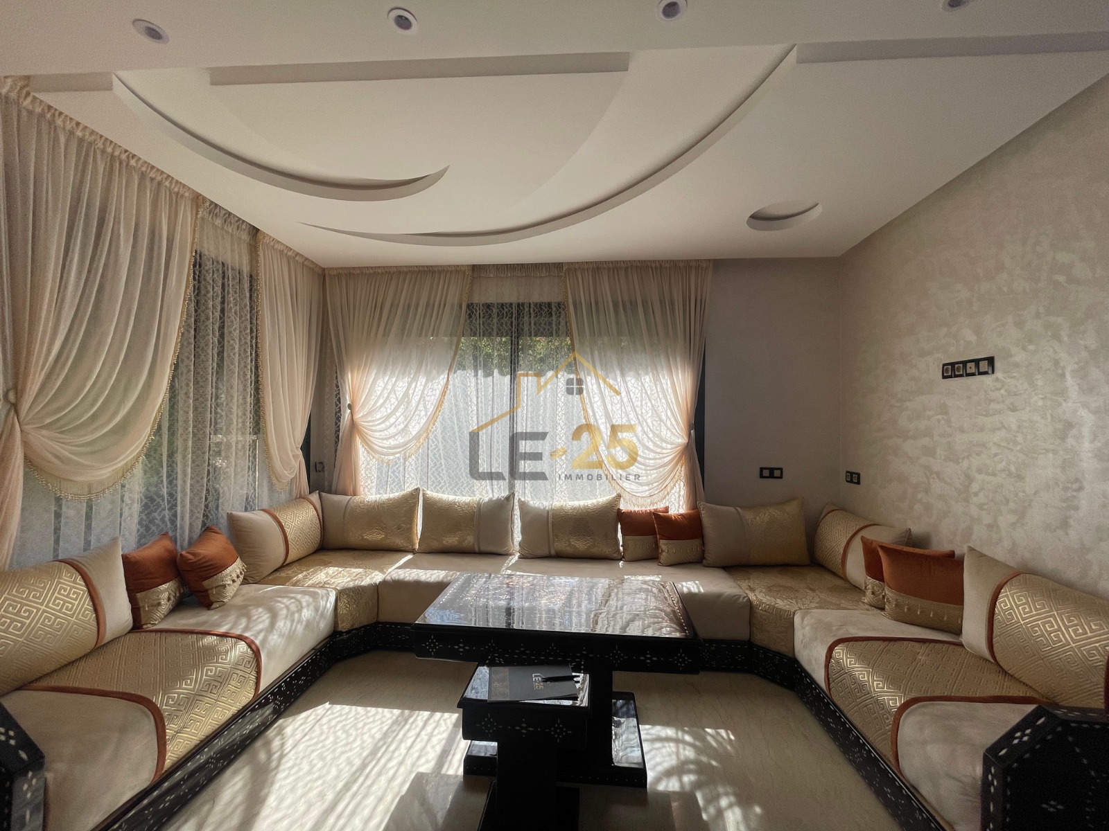 Dès l’entrée, la villa dévoile deux salons marocains spacieux ainsi qu’un toilette invités, avant de mener vers un salon européen lumineux donnant directement sur la piscine, idéal pour profiter pleinement des espaces extérieurs.